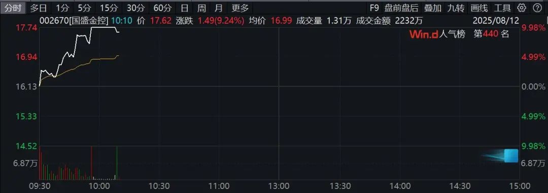 券商等大金融板块走强,国盛金控开盘后直线涨停,汇金股份、哈投股份、天利科技涨超5%,湘财股份、广发证券、中银证券、信达证券、华鑫股份等跟涨。