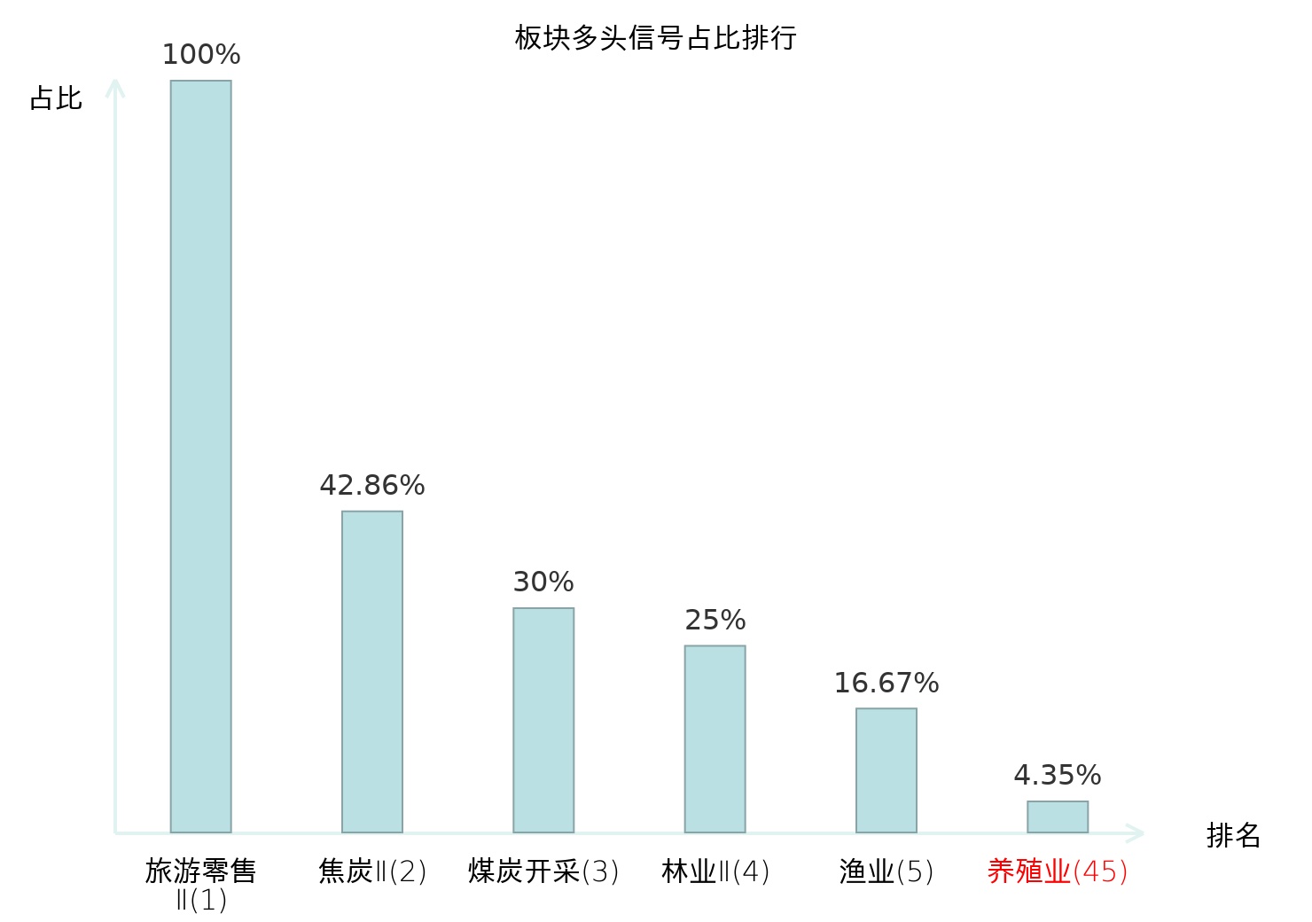 全市场所有行业板块中主力多头信号占比排名中,旅游零售Ⅱ板块位居第一。旅游零售Ⅱ板块名次提升最快,较昨日上升130位。
