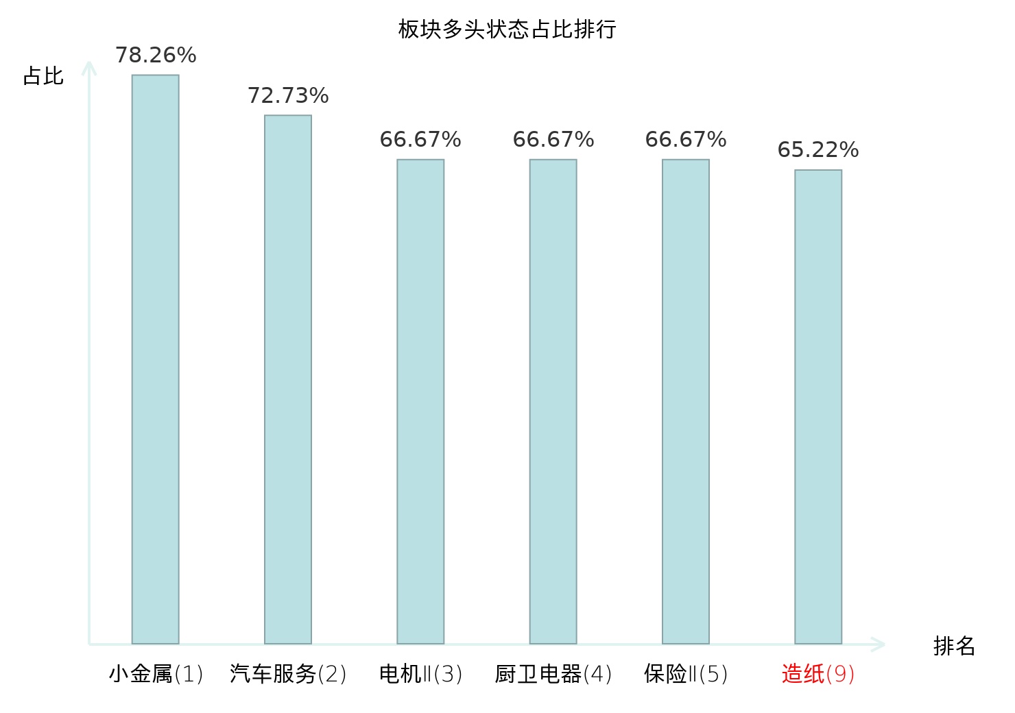全市场所有行业板块中主力多头状态占比排名中,小金属板块位居第一。农业综合Ⅱ板块名次提升最快,较昨日上升88位。