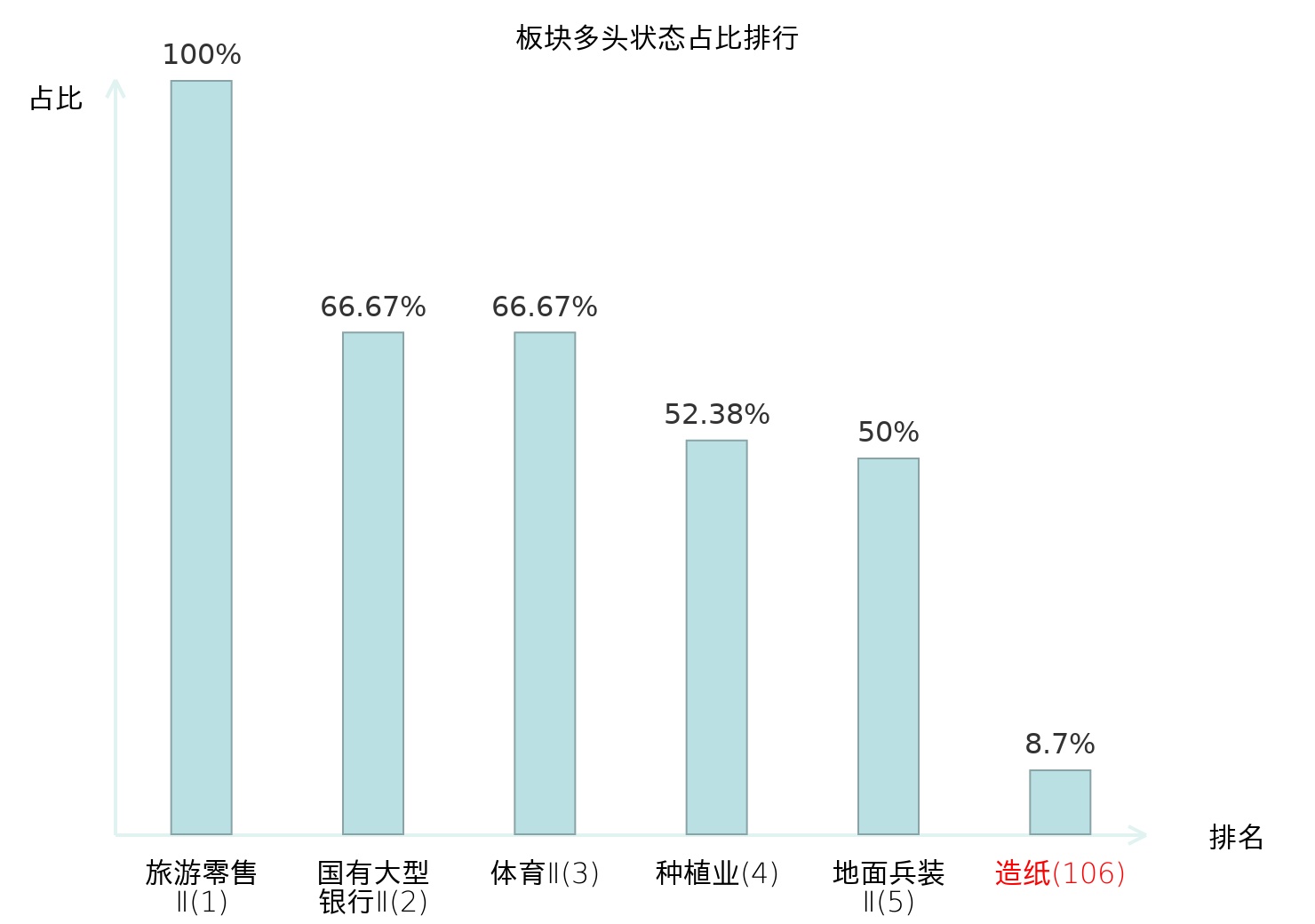 全市场所有行业板块中主力多头状态占比排名中,旅游零售Ⅱ板块位居第一。股份制银行Ⅱ板块名次提升最快,较昨日上升54位。