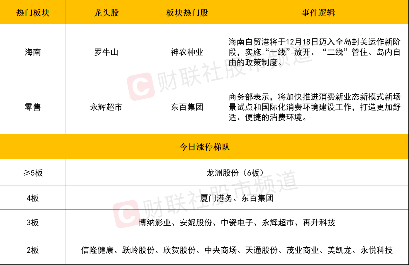 零售概念表现活跃,永辉超市3连板,茂业商业、中央商场、东百集团、步步高、汇嘉时代等个股涨停。