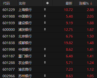 银行股显著走强,农业银行(601288)、中信银行(601998)、浦发银行(600000)等多股刷新历史新高。机构分析认为,一揽子金融政策出台,结构性工具加力,银行基本面积极因素持续积累,业绩拐点可期。