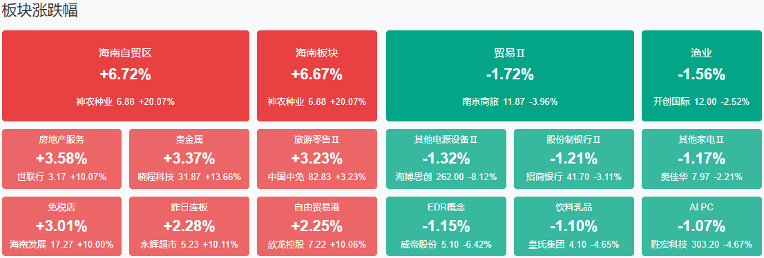 市场探底回升,三大指数涨跌不一,深成指、创业板指盘中先后翻红,创业板指此前一度跌超2%。沪深两市成交额1.78万亿,较上一个交易日缩量1254亿。盘面上,市场热点快速轮动,全市场超2800只个股下跌。从板块来看,海南板块持续走强,罗牛山、海南瑞泽等多股涨停。零售概念表现活跃,永辉超市3连板,茂业商业、中央商场2连板。算力硬件概念回暖,新易盛再创历史新高,长飞光纤涨停。下跌方面,银行板块走弱,招商银行、农业银行下挫。