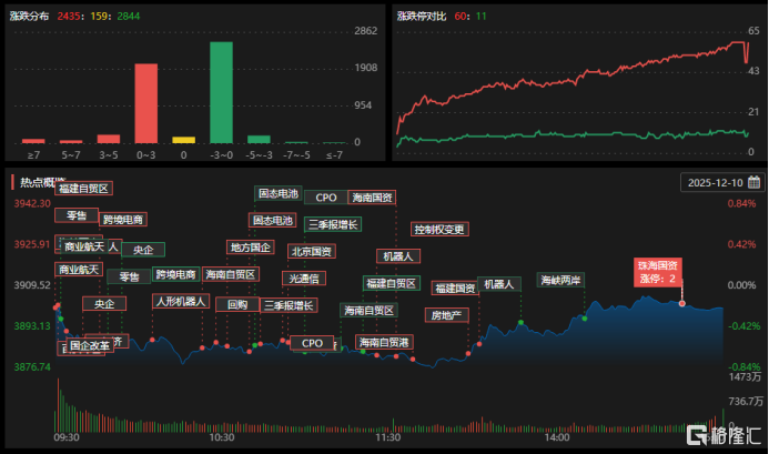 12月10日,沪指跌0.23%报3900点,深证成指涨0.29%,创业板指跌0.02%。全市场成交额1.79万亿元,超2800股下跌。海南板块、免税概念、贵金属、共享经济、商业百货及教育等板块涨幅居前;培育钻石、电源设备、乳业股等板块跌幅居前。