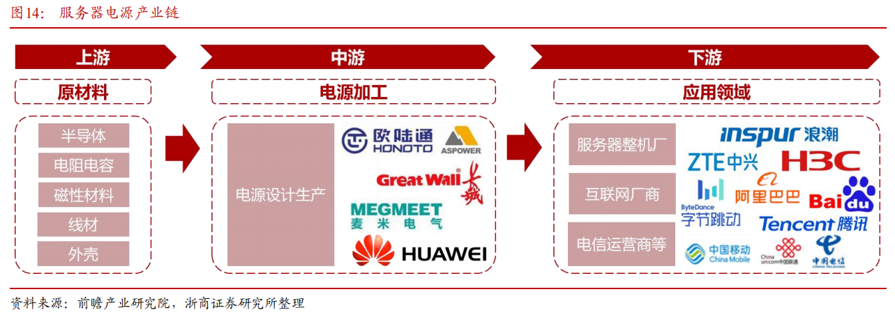 服务器电源属于开关电源,采购决策由服务器厂商与最终用户共同决定。电源产业链上游主要包括半导体、电阻电容、磁性材料等原材料,上游功率器件将直接影响电源性能,同时半导体材料的成本影响电源最终定价;中游则包括加工设备企业和电源加工服务企业,主要由台系厂商台达、光宝、国内厂商中国长城、欧陆通、麦格米特、华为数字能源等构成;下游包括服务器整机厂如浪潮、中兴、新华三等,以及服务器需求方如互联网厂商、电信运营商等,服务器整机厂与最终用户在电源供应商选择上都具有一定话语权。
