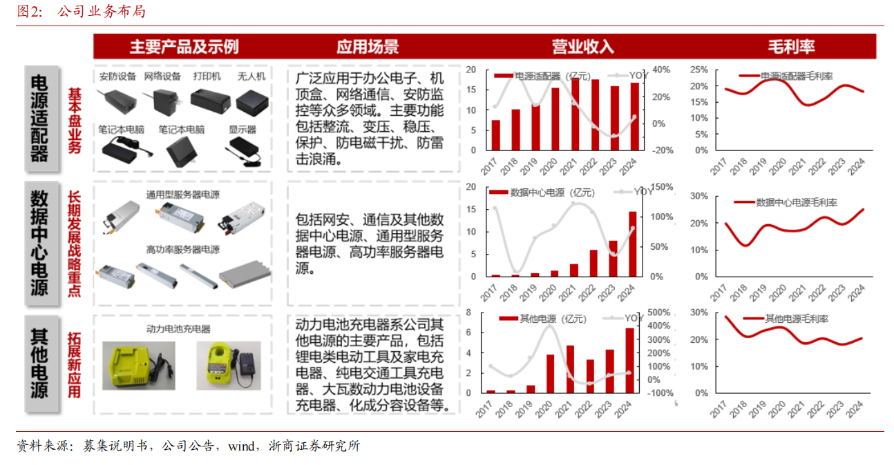 历经二十余年发展,公司已形成电源适配器、数据中心电源和其他电源三大业务布局,产品广泛应用于办公电子、网络通信、安防监控、智能家居、新型消费电子设备、数据中心、动力电池设备、纯电交通工具、化成分容设备等众多领域。数据中心电源:公司长期发展战略重点,数据中心电源包含风冷CRPS电源、浸没式液冷电源、定制GPU电源、集中式供电解决方案等,可应用于数据中心、液冷服务器、通用服务器、AI服务器、存储器等领域,涵盖了800W以下、800-2000W、2000W以上等全功率段产品系列,高功率服务器电源研发技术和产品处于国内领军水平,比肩国际高端品牌,是全球市场少数实现高功率服务器电源规模销售的供应商,已陆续为浪潮、富士康、华勤、联想、中兴、新华三等国内知名服务器厂商供货。