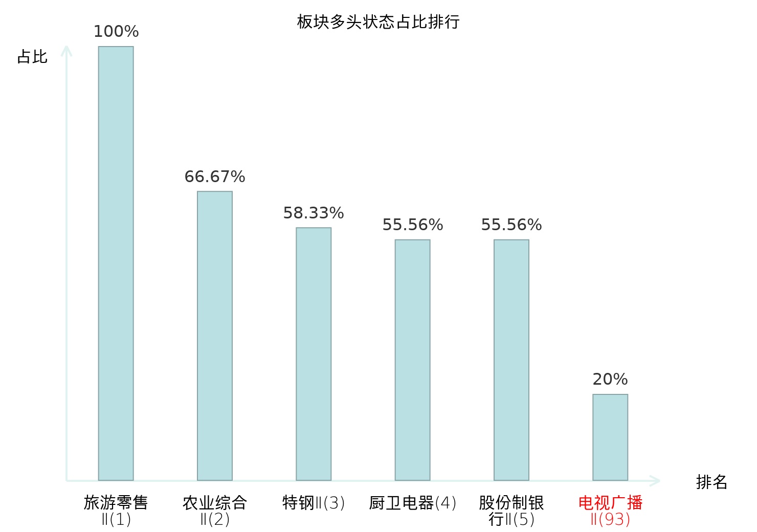 全市场所有行业板块中主力多头状态占比排名中,旅游零售Ⅱ板块位居第一。农业综合Ⅱ板块名次提升最快,较昨日上升127位。