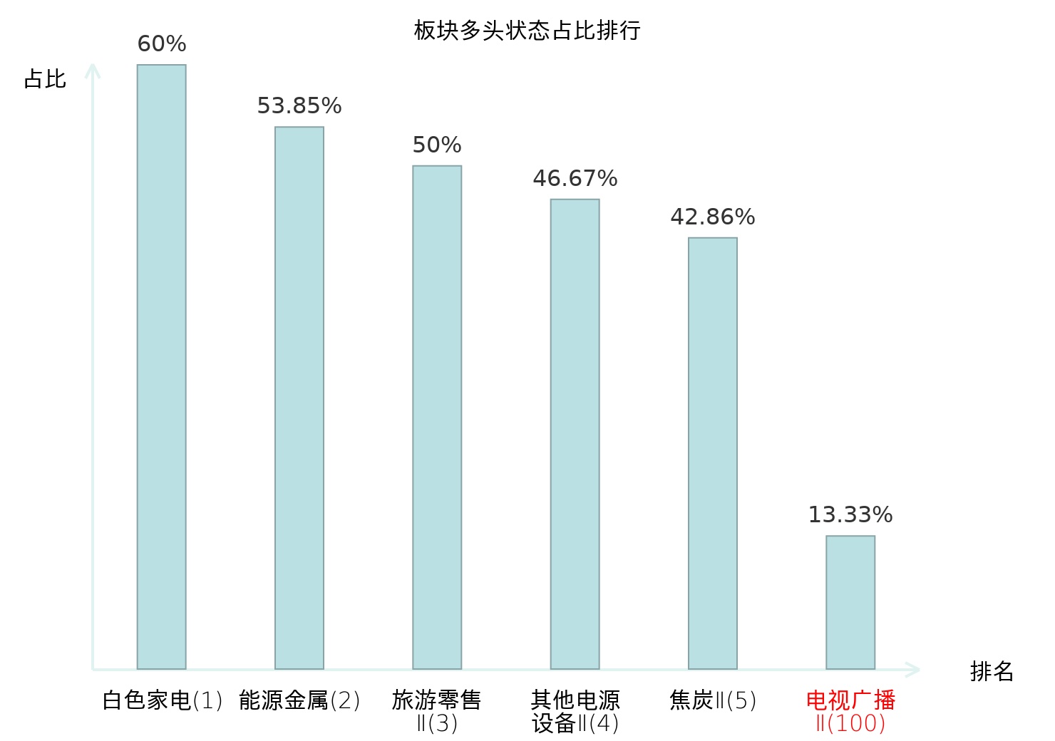 全市场所有行业板块中主力多头状态占比排名中,白色家电板块位居第一。油服工程板块名次提升最快,较昨日上升87位。