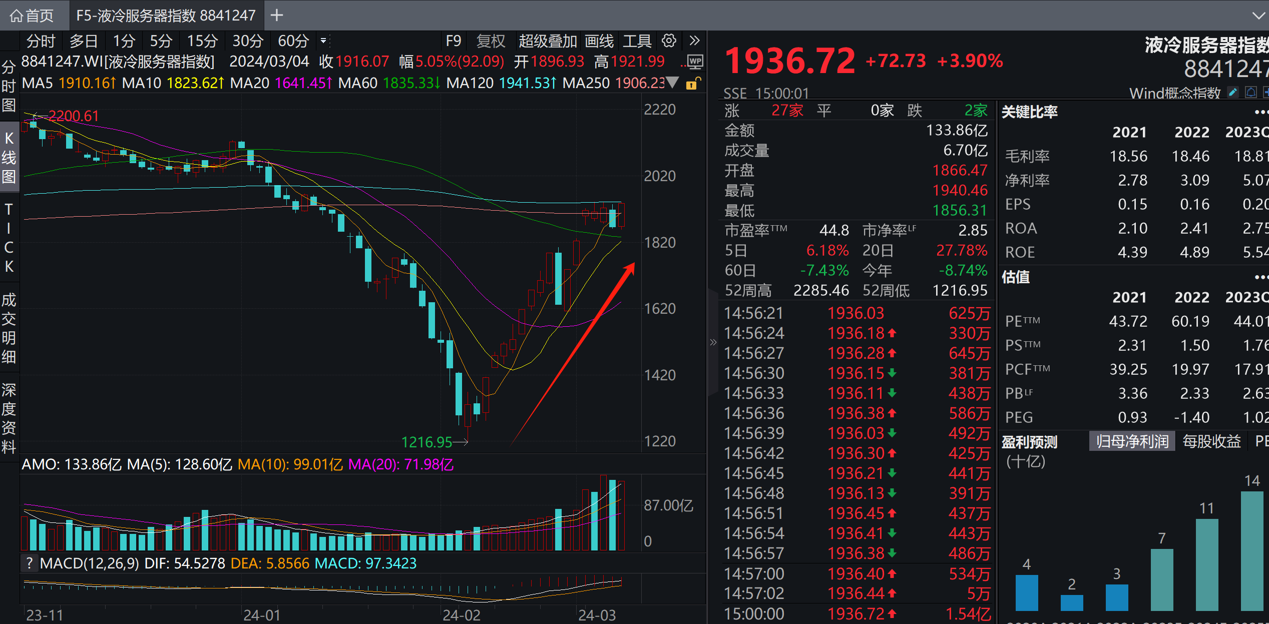 人工智能等新兴技术热潮汹涌,算力时代疾驰而至。服务器作为算力的基石,正朝着多元计算、绿色低碳等方向发展。尤其在“双碳”政策的持续推进下,绿色低碳的液冷服务器备受青睐,成为算力减碳的“排头兵”。英伟达即将推出的B100CPU将采用液冷散热技术,这一消息使得液冷服务器板块在A股市场受到追捧。根据wind液冷服务器指数,近一个月(2月6日至3月8日)指数区间涨幅为49.31%。