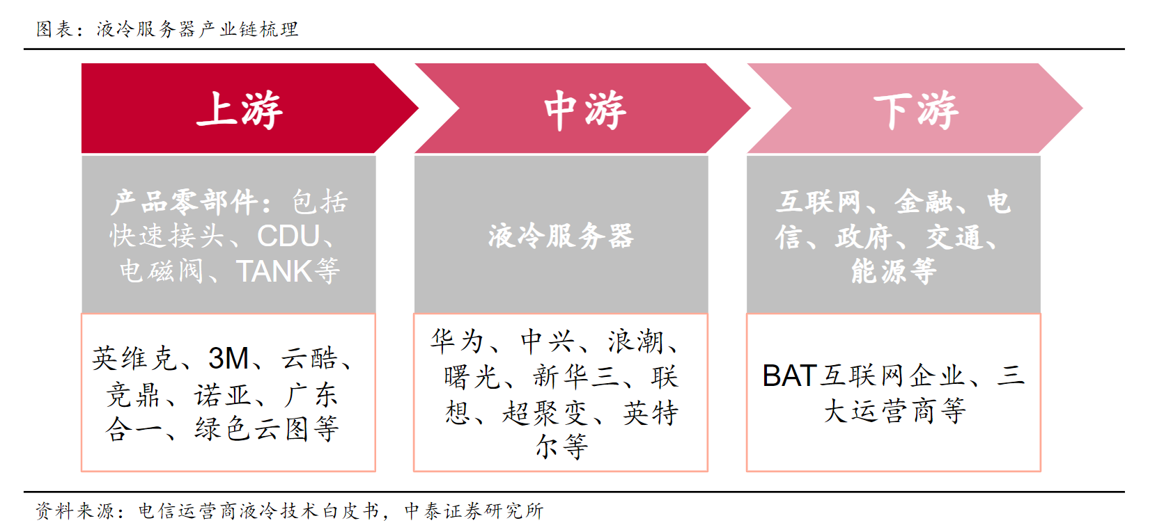 2024年国内政策多次加码智算中心建设,优秀服务器厂商加速落地国产AI生态系统,如华为发布2024数据中心能源十大趋势中就指出智算芯片需要采用液冷方式进行冷却,新华三、浪潮信息、中科曙光、超聚变等服务器厂商均积极发布液冷解决方案。其中,浪潮信息与英特尔联合发布的全球首个全液冷冷板服务器参考设计,以及公司推出的全液冷冷板服务器,标志着液冷服务器技术的进步。此外,运营商在加速AI投资的同时也大力加速液冷落地,如中国电信在上海投资建设全国规模最大的运营商级智算中心,将全部采用液冷散热方案,液冷市场弹性空间不断扩大。根据中泰证券苏仪等人在1月17日研报中梳理,液冷服务器产业链中上游产品零部件、中游服务器厂商相关标的包括英维克、中兴通讯、浪潮信息、中科曙光、紫光股份(新华三母公司)等。