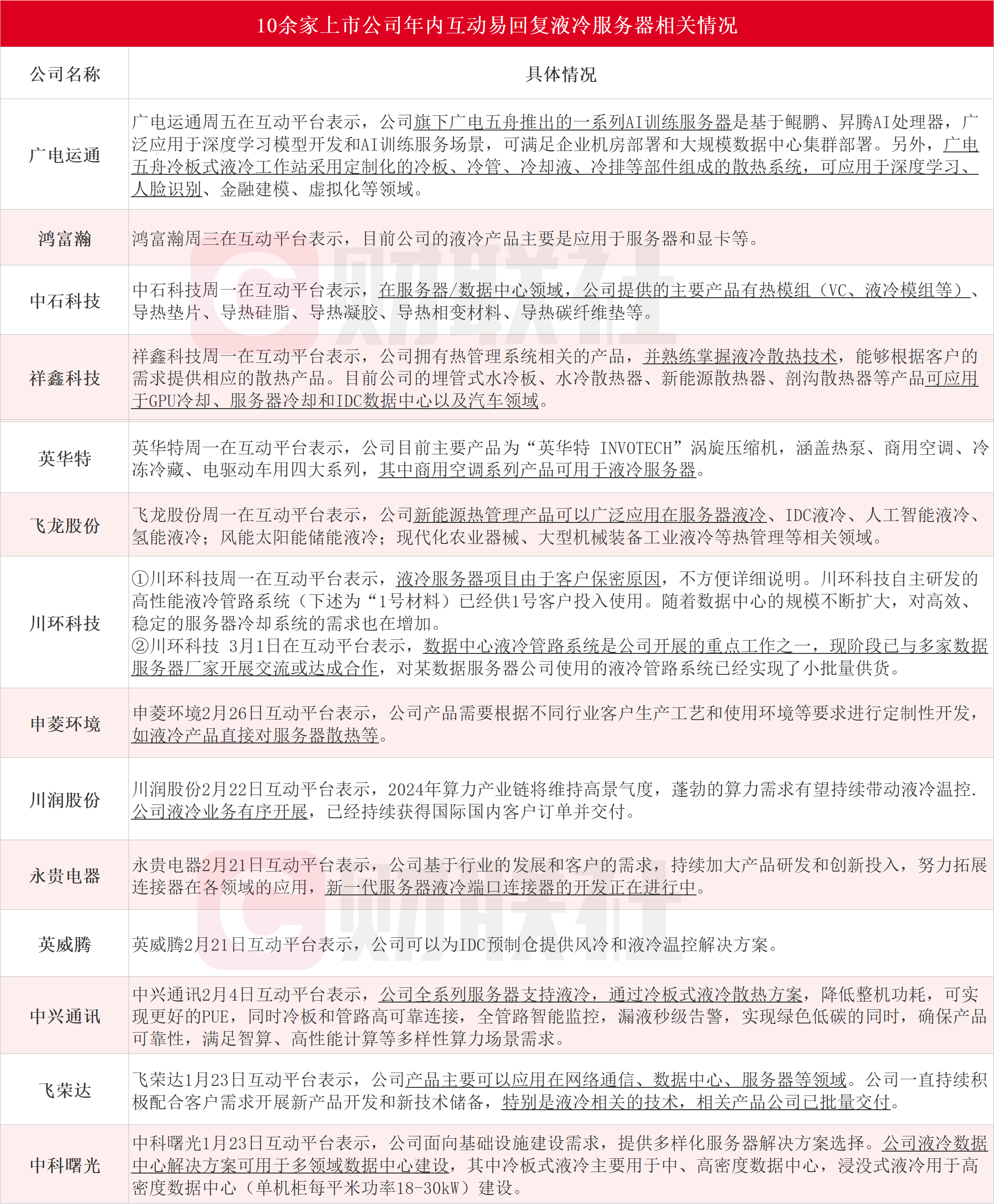 据财联社不完全统计,广电运通、鸿富瀚、中石科技、祥鑫科技、英华特、飞龙股份、川环科技、申菱环境、川润股份、永贵电器、英威腾、中兴通讯、飞荣达、中科曙光在内的13家上市公司年内回复液冷服务器相关业务情况。其中,广电运通周五在互动平台表示,公司旗下广电五舟推出一系列AI训练服务器是基于鲲鹏、昇腾AI处理器,可广泛应用于深度学习模型开发和AI训练服务场景。另外,广电五舟冷板式液冷工作站采用定制化的冷板、冷管、冷却液、冷排等部件组成的散热系统,可应用于深度学习、人脸识别、金融建模、虚拟化等领域。具体情况如下图:
