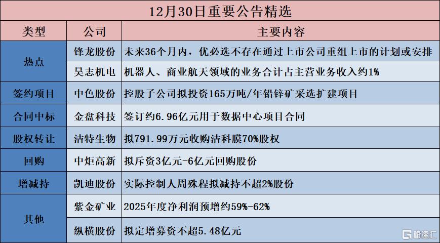 格隆汇公告精选︱紫金矿业:2025年度净利润预增约59%-62%;昊志机电:机器人、商业航天领域的业务合计占主营业务收入约1%