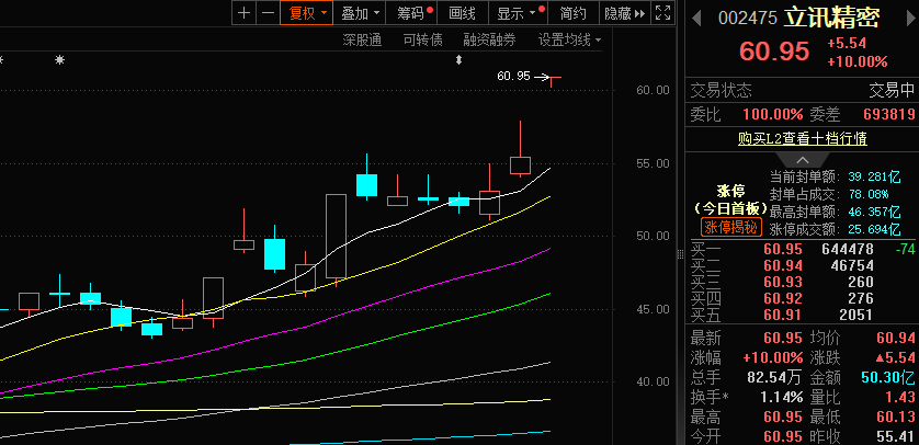 立讯精密早盘罕见一字涨停,最大封单超46亿元。