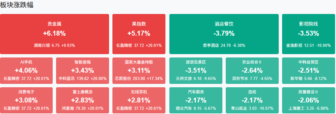 板块方面,贵金属、芯片产业链、消费电子等板块涨幅居前,影视院线、旅游、白酒等板块跌幅居前。截至收盘,沪指涨0.22%,深成指涨0.67%,创业板指涨0.55%。