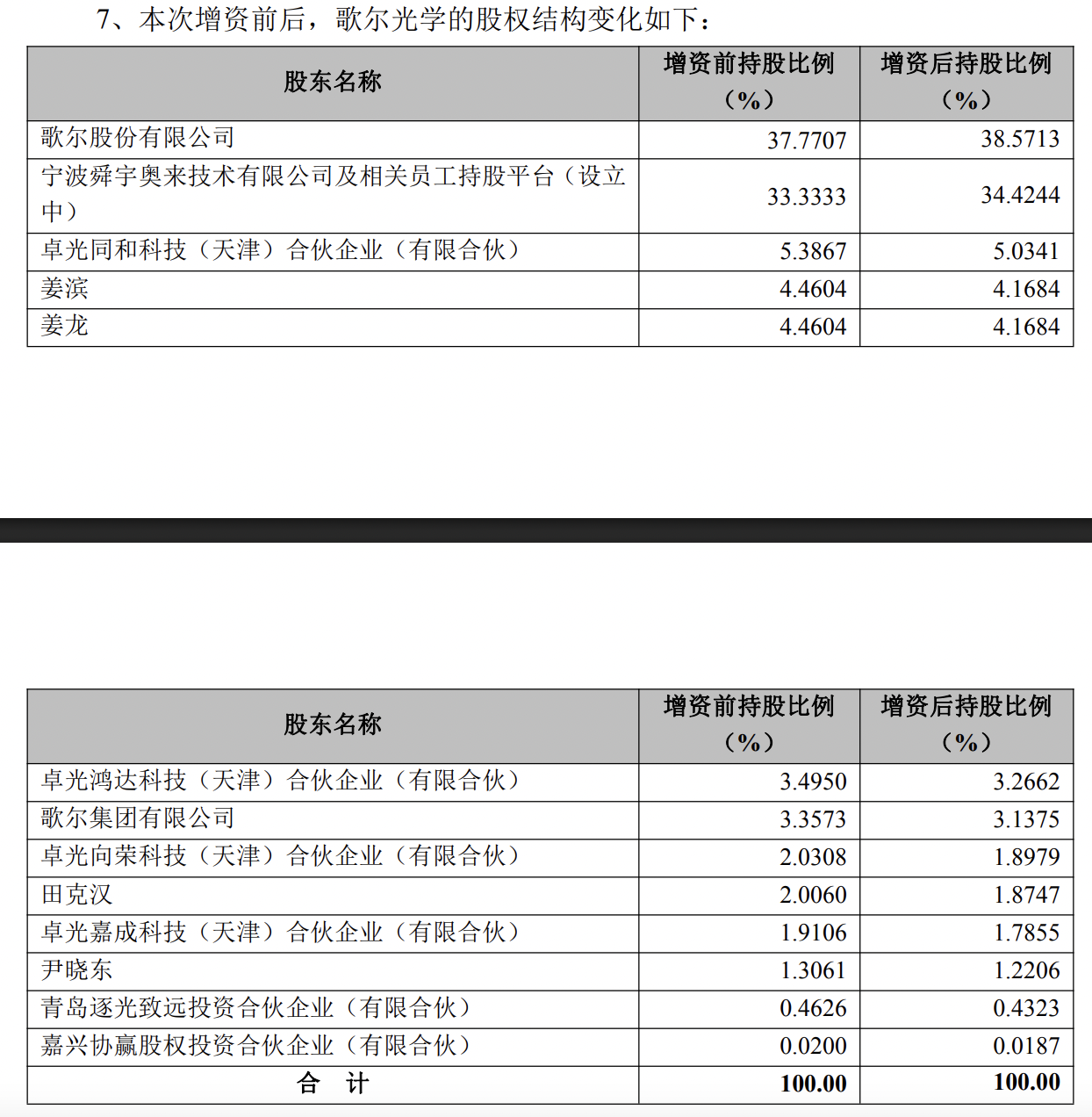 换股交易完成后,歌尔股份及宁波奥来拟分别向歌尔光学增资2亿元,各认购新增注册资本5564.06万元,合计新增注册资本11128.12万元,歌尔光学其他股东均放弃优先认购权。增资后,歌尔股份对歌尔光学的持股比例将增至38.57%,宁波奥来及相关员工持股平台持股34.42%,其他股东持股比例相应调整。