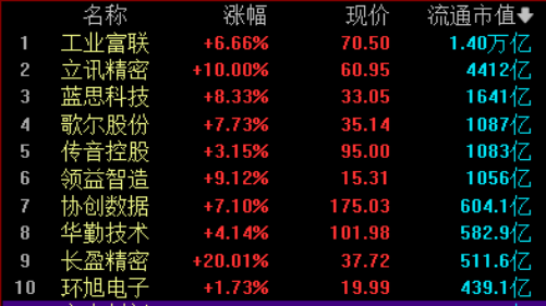 而消费电子全天维持强势,立讯精密涨停之后全天没有大单抛压,封的很稳,蓝思科技、歌尔股份、领益智造等也都大涨在分时高位区。下午长盈精密涨停大涨20%,上周连续3天炒作机器人的时候堆量大涨,周五机器人板块调整,因此缩量回踩5日线,今天在果链消息助攻下尾盘封板,预计后续还有冲高。消费电子板块涨的好的不少都是大市值中军股,流动性好,题材消费电子+AI,不少叠加机器人,在不同题材炒作节奏中切换,不过消费电子这波和超国产算力类似,都是资金抱团,散户跟风的效果。