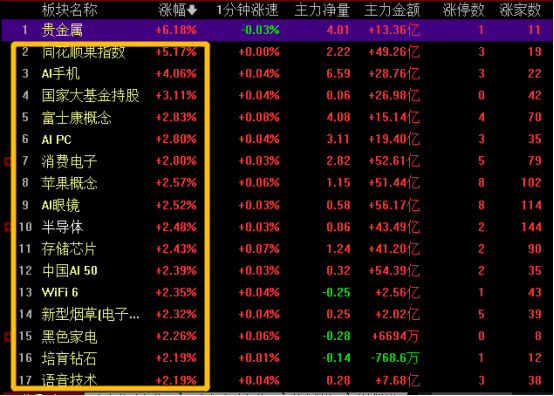 题材表现上涨幅居前的基本还是我们中午午间复盘说的一些方向,唯一的变化是贵金属在午后出现明显的拉升大涨。美联储的降息利好全球流动性,利好黄金等贵金属。