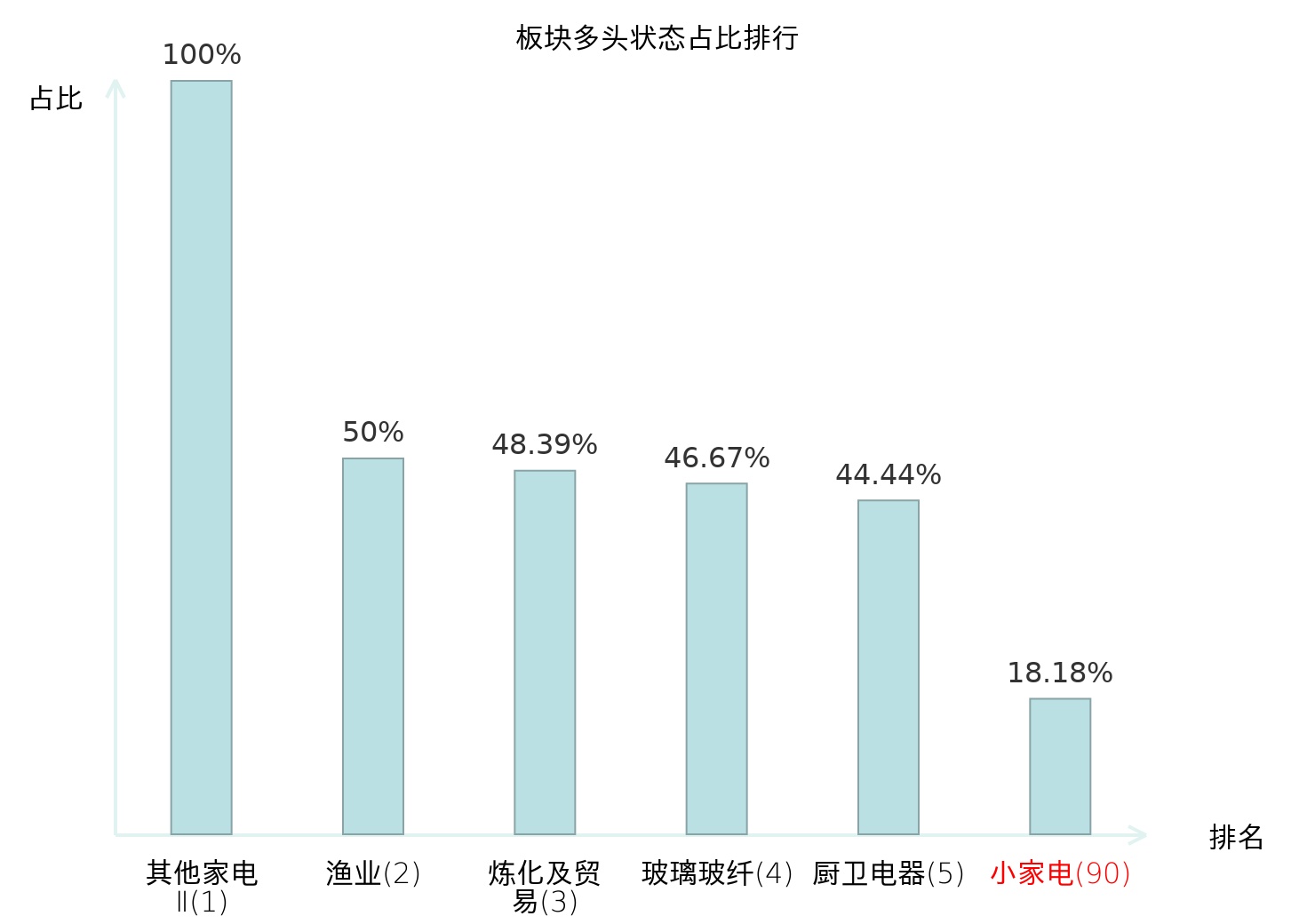 全市场所有行业板块中主力多头状态占比排名中,其他家电Ⅱ板块位居第一。冶钢原料板块名次提升最快,较昨日上升67位。