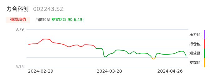 我们来看一下该股的九方特色指标强弱趋势的情况:力合科创自04月17日从支撑区回到观望区。股价经过前期快速下跌后中途弱势整理。现在下跌动能有重新放大迹象,弱势反弹行情可能临近尾声。建议继续谨慎观望。