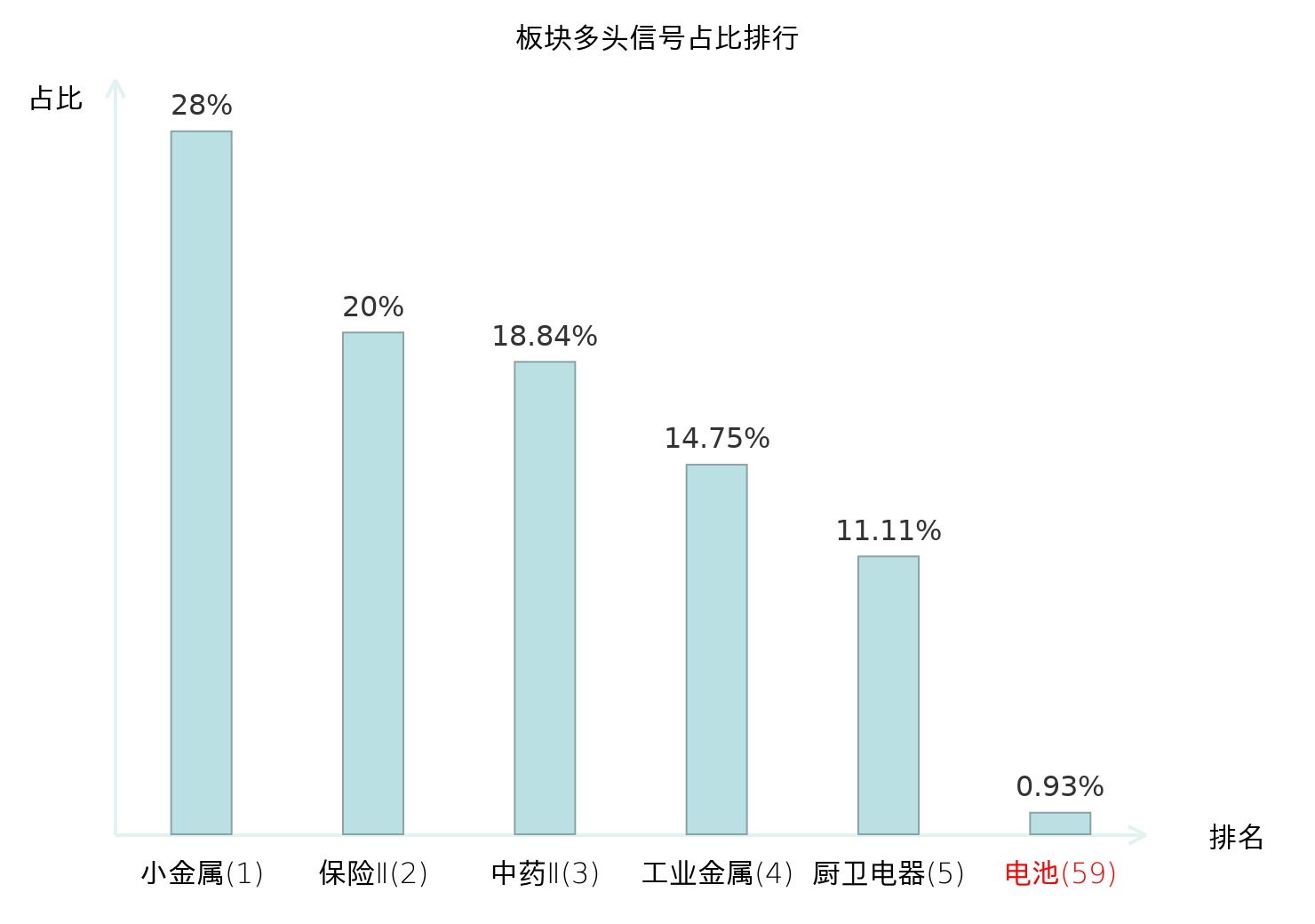 全市场所有行业板块中主力多头信号占比排名中,小金属板块位居第一。保险Ⅱ板块名次提升最快,较昨日上升123位。
