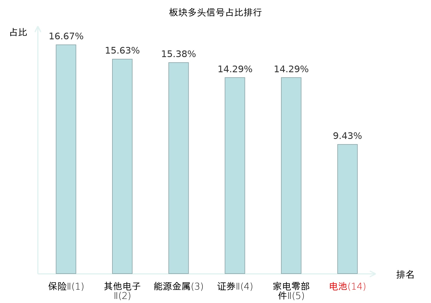 全市场所有行业板块中主力多头信号占比排名中,保险Ⅱ板块位居第一。城商行Ⅱ板块名次提升最快,较昨日上升97位。