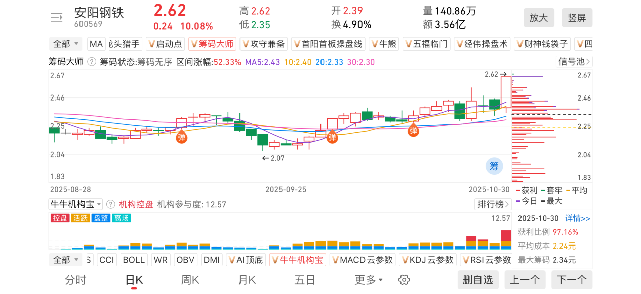 1)20251030-安阳钢铁-【筹码大师】和【牛牛机构宝】-近期出现弹信号且底部量柱由绿转红