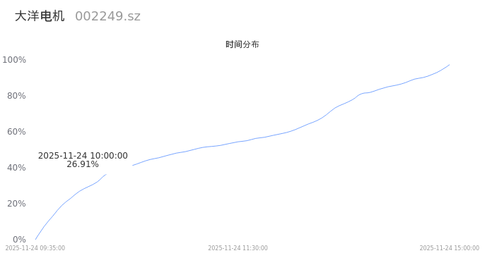 002249大洋电机2025年11月24日成交72.33万手,成交金额7.05亿,相较昨日缩量29.66万手,换手率3.95%,成交清淡。