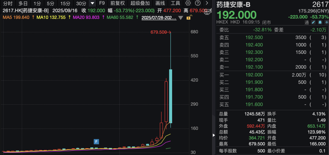 港股市场近期大牛股药捷安康出现大反转,早盘时还一度大涨逾63%,最高触及679.5港元/股,短短7个交易日上涨超10倍;以上市首日开盘价20港元计算,不到3个月时间飙涨超30倍,总市值一度达到逾2697亿港元。午后,药捷安康画风突变,快速跳水。截至收盘,跌逾53%,报192港元/股。