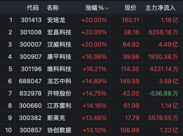 市场热点方面,机器人产业链全线走强,板块指数高开高走,以最高点报收。板块内个股掀涨停潮,安培龙、宏昌科技、汉威科技等多股20%涨停,万向钱潮、三花智控、双环传动等超40股涨停或涨超10%。