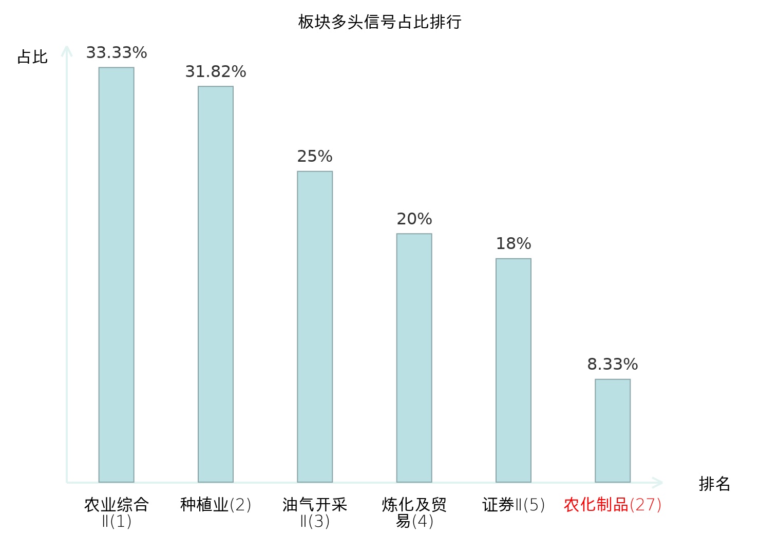 全市场所有行业板块中主力多头信号占比排名中,农业综合Ⅱ板块位居第一。农业综合Ⅱ板块名次提升最快,较昨日上升127位。