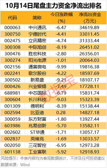 净流出方面,中兴通讯、宁德时代、立讯精密尾盘主力资金净流出均超3亿元;中际旭创、胜宏科技、阳光电源资金净流出均超2亿元。