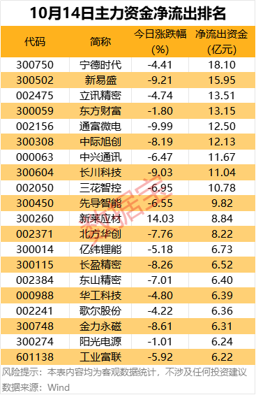 56股主力资金净流出超3亿元,其中,宁德时代、新易盛、立讯精密、东方财富、通富微电、中际旭创等净流出金额均超10亿元。