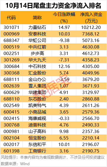 安泰科技、华虹公司、中兵红箭、步步高等尾盘主力资金净流入也均超4000万元。