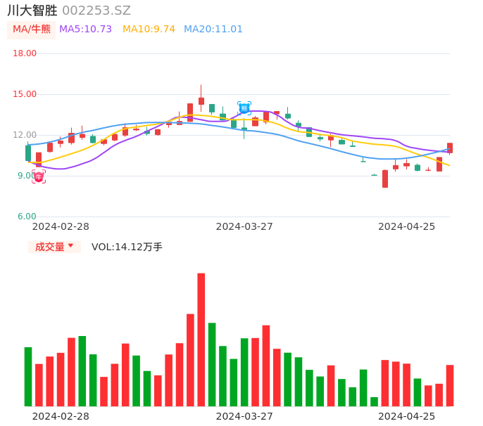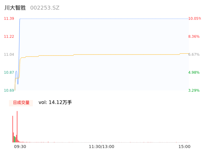 04月25日,川大智胜收报11.39,股价涨幅10.05%,成交金额1.56亿元,换手率6.82%。