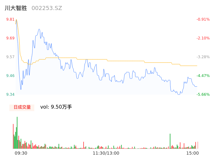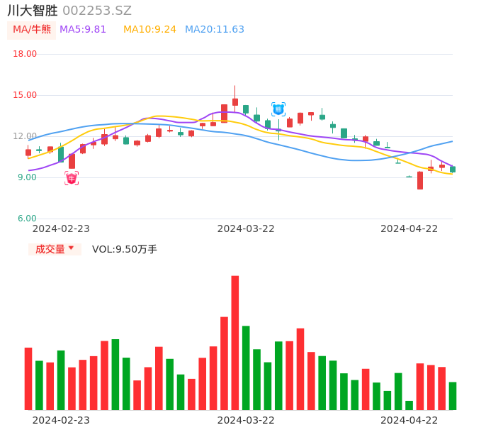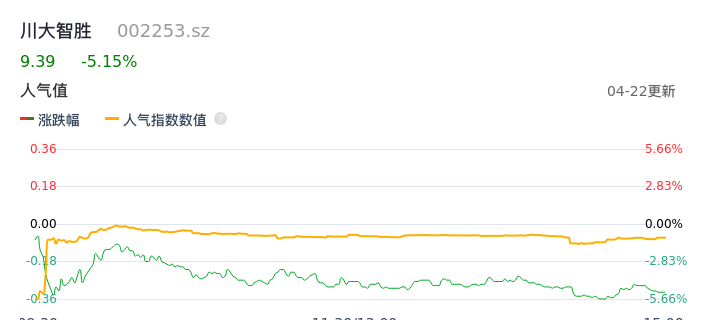 04月22日,川大智胜收报9.39,股价涨幅-5.15%,成交金额9038.76万元,换手率4.59%。