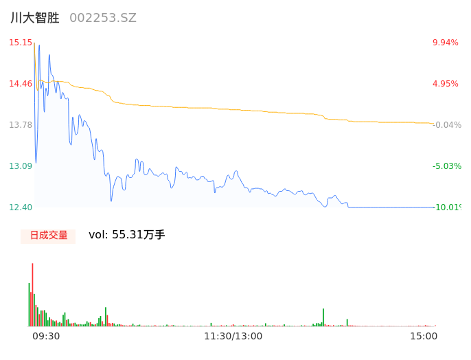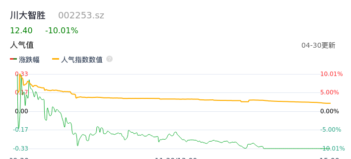 04月30日,川大智胜收报12.40,股价涨幅-10.01%,成交金额7.63亿元,换手率26.70%。