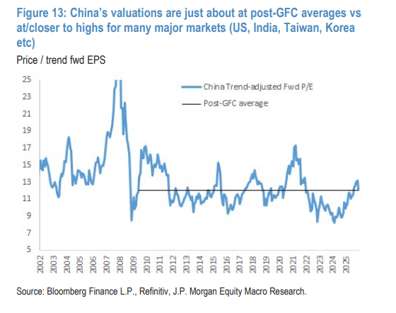 在经历了长期的调整后,市场的风险回报比变得更具吸引力。报告分析称,“因此,估值仍然可以接受,仓位也仍然较轻。” 摩根大通的图表显示,与其他主要市场(如美国、印度、台湾等)的估值已处于或接近历史高位相比,中国的估值水平仅处于后全球金融危机时期的平均水平。