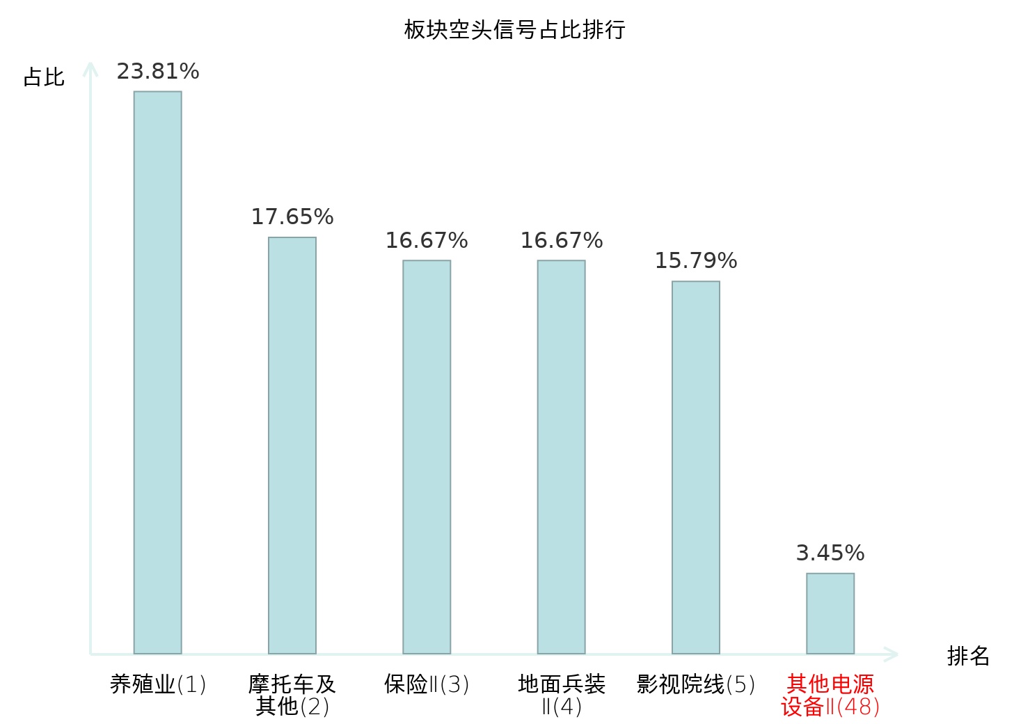 全市场所有行业板块中主力空头信号占比排名中,养殖业板块位居第一。养殖业板块名次提升最快,较昨日上升114位。