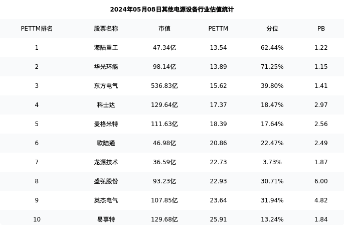 海陆重工最新报告期数据为一季度,下表汇总了其他电源设备行业内市值靠前的公司一季度主要经营数据