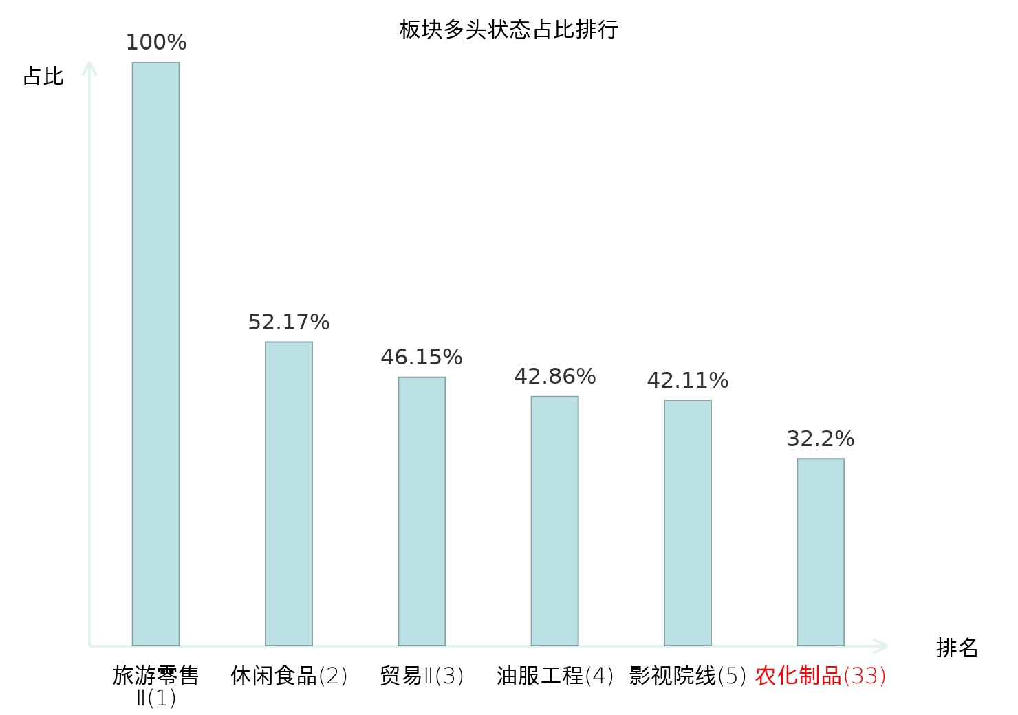 全市场所有行业板块中主力多头状态占比排名中,旅游零售Ⅱ板块位居第一。体育Ⅱ板块名次提升最快,较昨日上升99位。