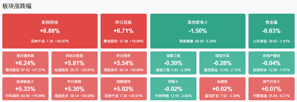 板块方面,影视、液冷服务器、CPO、金融科技等板块涨幅居前,煤炭等少数板块下跌。截至收盘,沪指涨1.18%,深成指涨2.25%,创业板指涨3.63%。