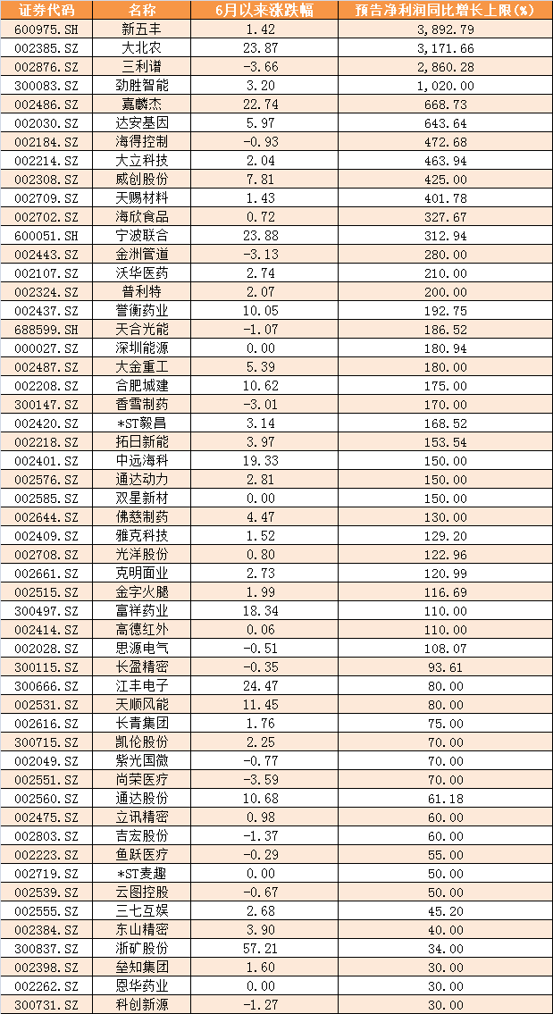 业绩预增公司中,新五丰、大北农、三利谱、劲胜智能中报预告净利润同比增长上限超过10倍,另有嘉麟杰、达安基因、海得控制、大立科技、威创股份、天赐材料、海欣食品、宁波联合、金洲管道、沃华医药、普利特、誉衡药业、天合光能、深圳能源、大金重工、合肥城建、雅克科技、克明面业、金字火腿等30只个股预告净利润同比增长上限超过00%。