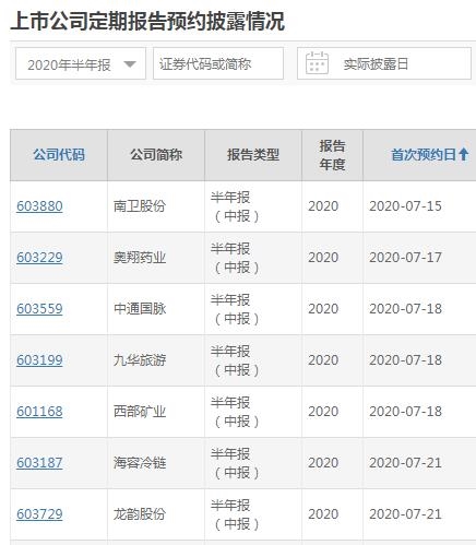 上交所上市公司半年报首次预约披露时间出炉,南卫股份将于7月15日发布沪市首份半年报。此外,奥翔药业7月17日披露,中通国脉、九华旅游、西部矿业的半年报首次预约日为7月18日。