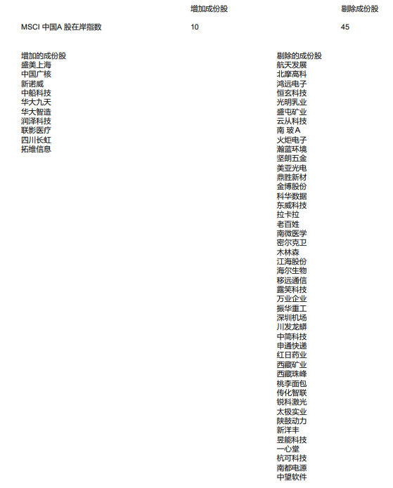 MSCI中国A股指数本次新增17只成份股,剔除10只标的。MSCI中国A股在岸指数新增10只成份股,剔除45只成份股。