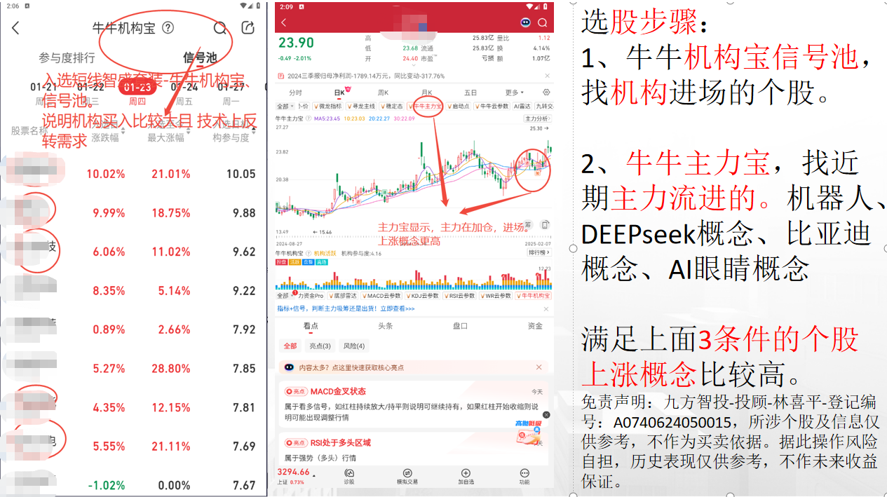 2、智胜套装—“牛牛信号池”可以找到,日内机构买入排名靠前的投资品种,且个股都是有反转信号。(题材上—机器人、DEEPseek概念、比亚迪概念、AI眼睛概念)