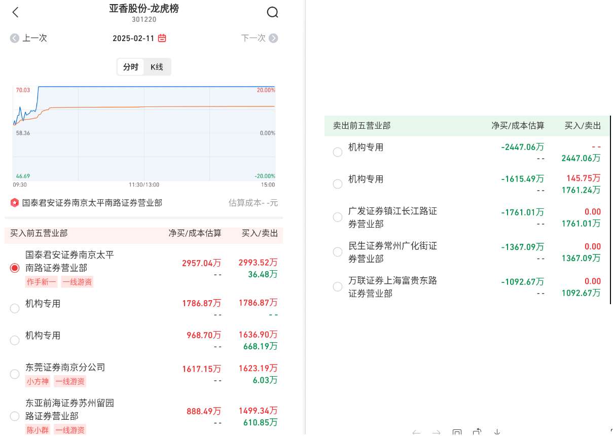 从榜单分析来看,机构与作手新一与东莞南京分位列买一到买四,主要逻辑是分支的龙头股,所以这里市场走强之后整体的分歧降低,比如光线传媒与这个亚香都有资金在做,代表行情中位的股溢价程度下滑,这两个方向如果溢价大幅度降低,就要考虑市场行情是否接近尾声,把他们当做中位的题材亏钱效应的反馈即可。