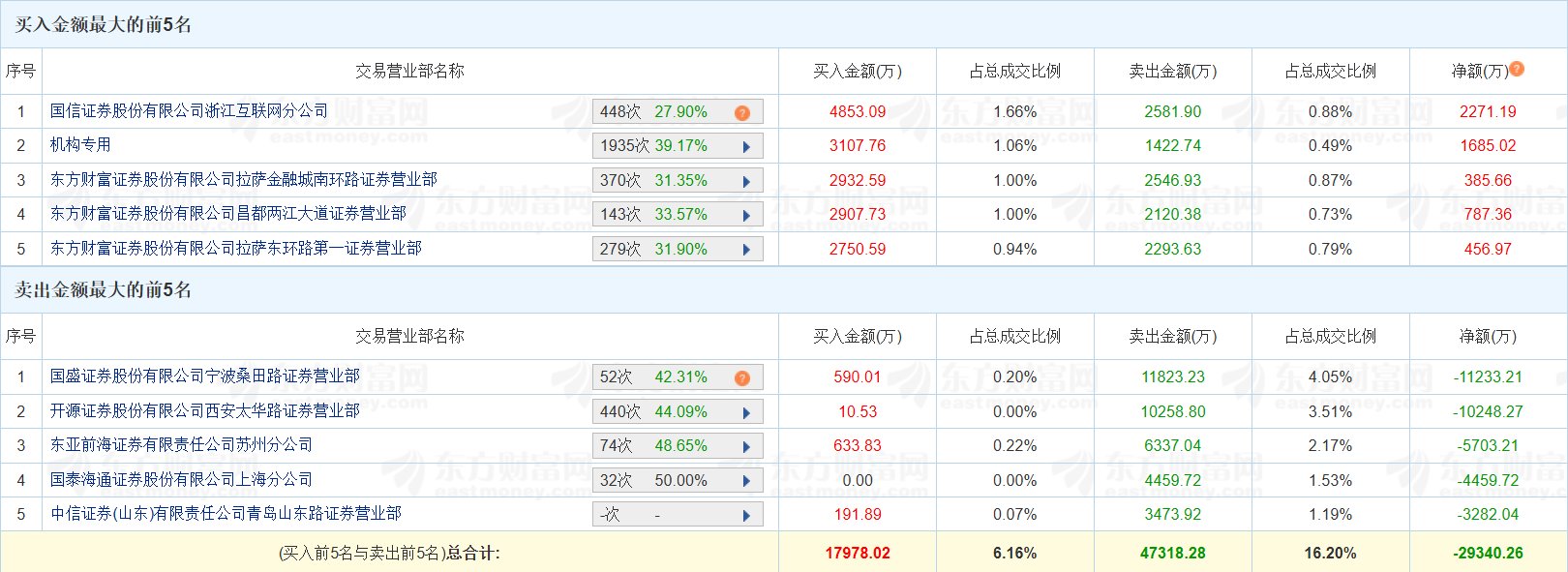 龙虎榜丨大东南跌1.48%,二游资净卖出2.15亿元