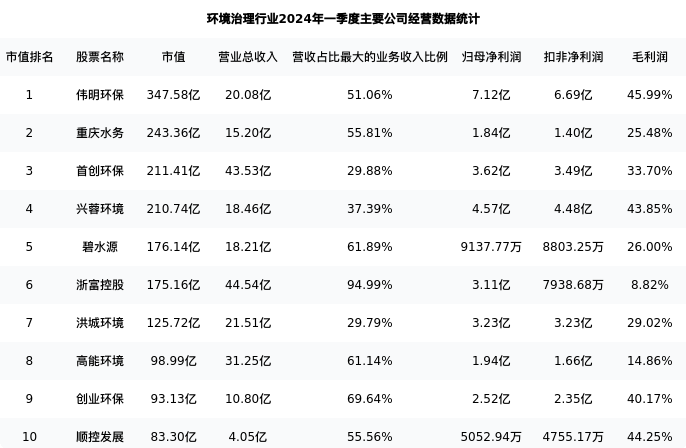 浙富控股最新报告期数据为一季度,下表汇总了环境治理行业内市值靠前的公司一季度主要经营数据