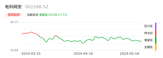 我们来看一下该股的九方特色指标强弱趋势的情况:电科网安自04月17日从支撑区回到观望区。股价经过前期快速下跌后中途弱势整理。现在下跌动能有重新放大迹象,弱势反弹行情可能临近尾声。建议继续谨慎观望。