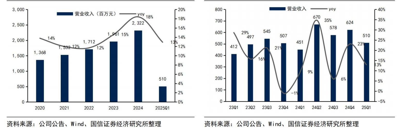 公司单季营业收入及增速(单位:百万元、%)(右)